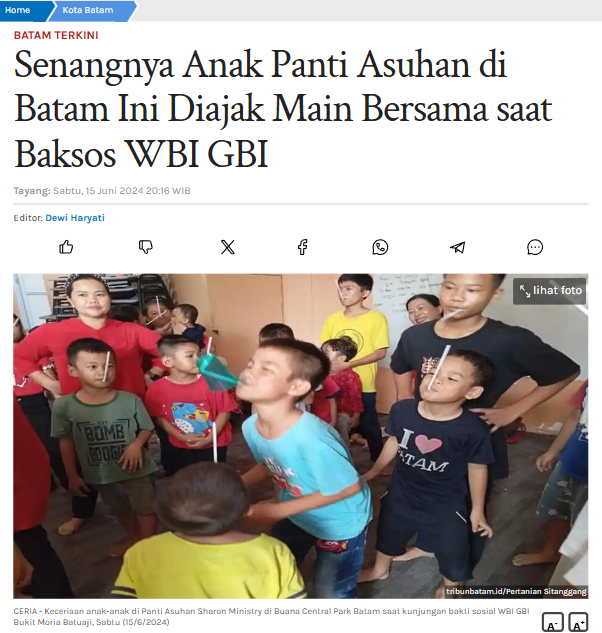 Keceriaan terpancar dari wajah anak - anak di Panti Asuhan Sharon Ministry yang ada di Komplek Perumahan Buana Central Park Batuaji, Kota Batam. Saat itu Wanita Bethel Indonesia (WBI) dari Gereja Bethel Indonesia (GBI) Bukit Moria Batuaji melakukan kunjungan dan bakti sosial ke panti asuhan, Sabtu (15/6/2024).