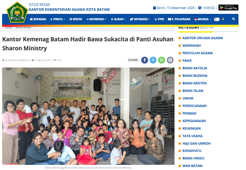 Batam, Senin 18 Agustus 2025 – Kantor Kementerian Agama Kota Batam melalui Kasi Urusan Agama Kristen, Penata Laksana, serta para Penyuluh Kristen melaksanakan kunjungan kasih ke Panti Asuhan Sharon Ministry. Kegiatan ini berlangsung sejak pukul 10.00 WIB hingga selesai, dengan disambut hangat oleh Ibu Indri Kasih selaku pembina panti.